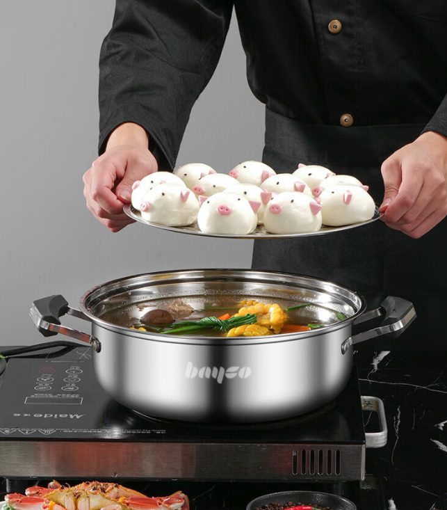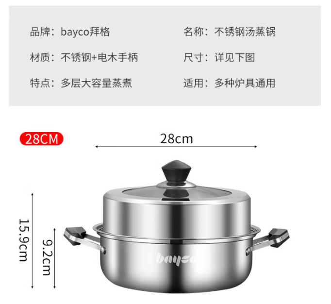 拜格(BAYCO)蒸锅家用不锈钢汤锅火锅燃气灶电磁炉通用大容量锅具28cm